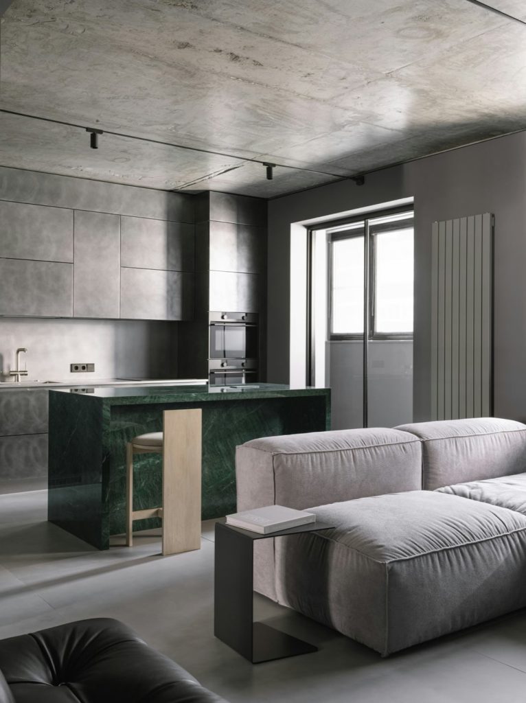 The rug defines the sleeping area and softens the transition between the low bed and the pale floor. Two ottomans in front of the fireplace continue its story in the same style. By using a flat, textural weave instead of a deep pile or pattern, the designer maintained a clean visual plane and a lightweight mood.